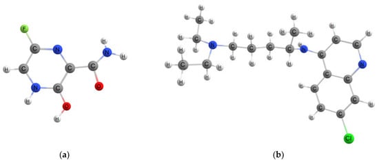 Chemical structures of (a) favipiravir and (b) chloroquine molecules.