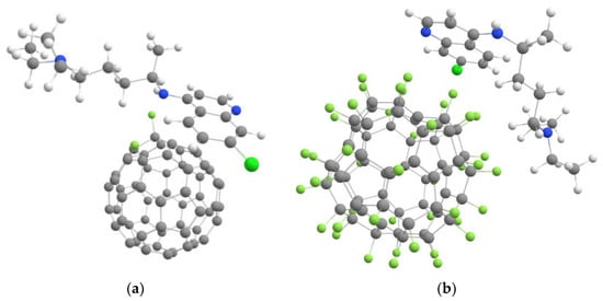 Optimized geometry of the chloroquine molecule loaded on fluorinated fullerenes (a) C60F2 and (b) C60F48.
