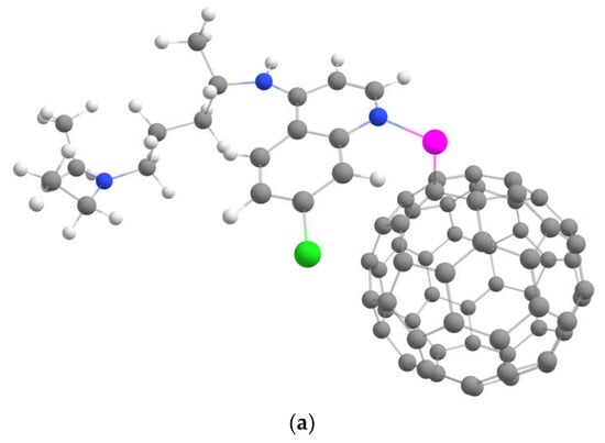 According to previous studies, the drugs interact poorly with the pristine C60. The binding energy between C60 and favipiravir in the gas phase is as low as 0.3 eV, and the presence of solvents changes it only by about 10% []. Chloroquine does not contain active oxygen atoms and, therefore, interacts even weaker with C60, possessing the binding energy of about 0.06 eV []. Therefore, any modification of pristine C60 is necessary for efficient drugs loading.