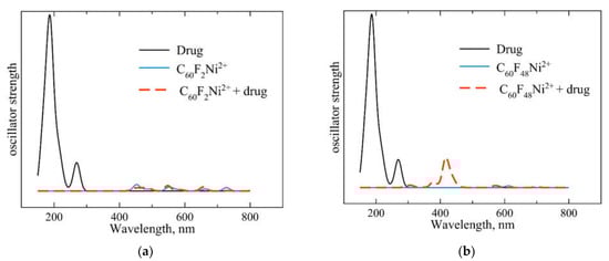 Figure 6 shows the active infrared frequencies and the corresponding intensities for the systems under consideration. It can be seen from Figure 6 that the spectrum of the “carrier + drug” system is not a simple sum of the spectra of its parts. Therefore, one can control the loading process by spectral measurements. Integral infrared absorption intensity of the “C60F2Ni2+ + drug” complex is much higher than absorption intensities of its parts (see Figure 6a). Therefore, drug loading on C60F2Ni2+ can be easily indicated. Loading the drug onto the C60F48Ni2+ cluster does not lead to such a significant change in the infrared spectrum. However, drug loading on C60F48Ni2+ results to an appearance of a series of active frequencies in the range of 590–700 cm−1.