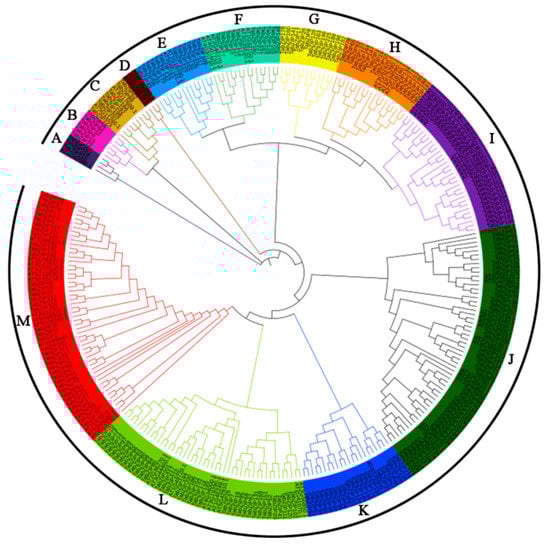 The phylogenetic tree of bZIP genes in wheat and A. thaliana. Different colors indicate different subfamilies (A–M).