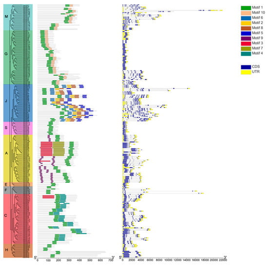 In the previous report by Agarwal et al., 191 TabZIP genes were identified []. Nevertheless, 36 new genes have been added to the current version (Table S1). In this study, 227 TabZIP gene family members were identified and analyzed from the wheat genome database. The results were compared to those of previously identified species Arabidopsis thaliana (75 genes) [], Solanum lycopersicum (69 genes) [], B.distachyon (96 genes) [], Oryza sativa (89 genes) [], Zea mays (125 genes) [], Glycine max (131 genes) [], Coniothyrium minitans (34 genes) [], Vitis vinifera (55 genes) [], Malus domestica (116 genes) [], Fragaria vesca (50 genes) [], Sorghum bicolor (92 genes) [], and Prunus persica (47 genes) []. The number of bZIP gene family members increased, but was relatively small compared with B. napus contain 247 bZIP genes []. It is not unusual for gene families to change in size due to gene duplication, deletion, pseudogenization, and functional diversification []. The bZIP gene of rice [], apple [], and grapevine [] can be divided into the same 10 subgroups as that of Arabidopsis [], which is basically consistent with the classification of wheat in our study. According to its evolutionary branch and gene motifs, this study divided wheat bZIP gene into nine groups for subsequent specific analysis (Figure 1). Different branches indicate functional differences or that these subfamilies have specific functions []. Group D contained only AtbZIP genes but no TabZIP genes, indicating that the TabZIP genes in these groups might have been lost or differentiated into other groups during the evolution of wheat []. Groups B and G contain only the TabZIP gene, suggesting that this clade may be specific to wheat [].