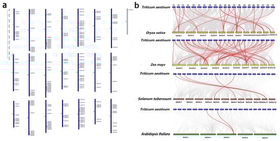 Collinearity analysis of TabZIP gene family. (a) Chromosome locations of TabZIP genes. The chromosome number is on the left side of each chromosome. The scale on the left represents chromosome length. (b) Synteny analysis of TabZIP genes between Triticum aestivum and four representative plant species. Gray lines indicate the collinear bars within the Triticum aestivum and other plant genomes, whereas the red lines highlight the syntenic TabZIP gene pairs.