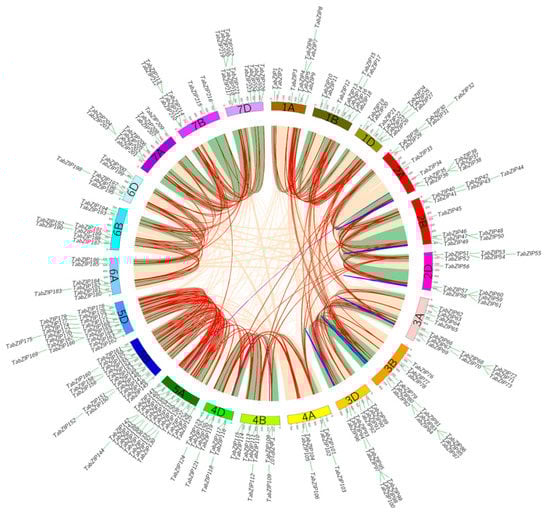 The syntenic pairs of wheat TabZIP genes from different duplication mode diagrams. Syntenic pairs from different duplication modes were linked by corresponding color lines. Red, blue, purple, and green represent syntenic regions with segmental, tandem, transposed, and proximal duplication. Others syntenic pairs genes were shown with pale yellow lines.