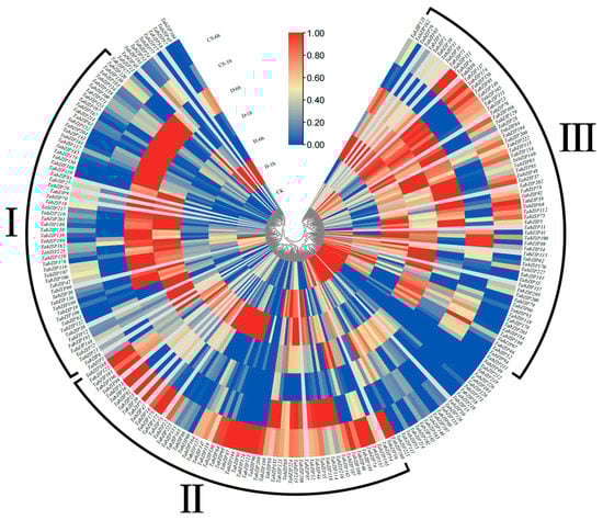 The potential role of wheat bZIP family in different abiotic stresses was analyzed based on RNA-Seq data. The RNA-Seq data were analyzed under the drought and high temperature of about 40 °C. Transcriptional levels of TabZIP genes at 1 h and 6 h after treatment were revealed. These treatments included drought for 1 h (D-1) and 6 h (D-6), high temperature for 1 h (H-1) and 6 h (H-6) at 40 °C, and the combination of the two stresses for 1 h (CS-1) and 6 h (CS-6). The TabZIP genes had a high expression in each type or time for treatment (Figure 6). Among them, red represented high/up-regulated expression of the genes, low/down-regulated expression genes were shown in blue, and yellow represents no significant difference in gene expression. The genes in group Ⅰ were significantly up-regulated under drought treatment. Except for Ⅲ groups of genes, the genes with high expression under heat stress were lower in drought condition. The number of differentially expressed genes was similar to heat treatment. It was noteworthy that TabZIP179 was the most significantly up-regulated gene under drought treatment, and it was also significantly up-regulated in H-6, while the most significantly up-regulated gene in H-1 was TabZIP191. In CS-1, almost all genes had the low expression, and genes with high expression in CS-6 were mainly in group Ⅱ. In group Ⅲ, the highly expressed genes were densely distributed in all treatments except CS-1.
