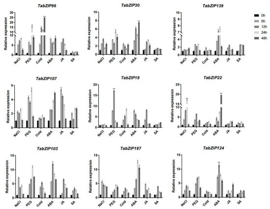 Relative expression analysis of 9 genes in the TabZIP gene family under cold stress, drought stress, salt stress, ABA treatment, JA treatment, and SA treatment in wheat. All values in the figure are mean ± SD (n = 3), p values (versus 0 h) were corrected with ANOVA, p < 0.05 indicates significant difference, indicated by *; p < 0.001 indicates high significance, indicated by **.