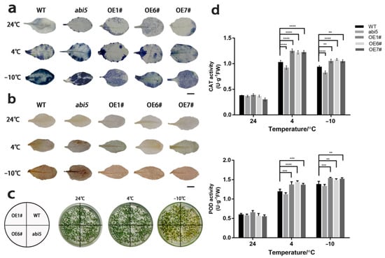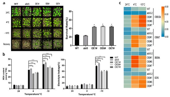 Arabidopsis was selected as the Columbian type. The abi5 (SALK_013163, Col-0 background) mutant was a kind gift from Dr. Gang Wu (State Key Laboratory of Subtropical Silviculture, School of Agriculture and Food Sciences, Zhejiang Agriculture and Forestry University) []. The culturing condition was 24 C, 16/8 photoperiod []. Four-week-old Arabidopsis thaliana was treated at 4 °C for 3 days, and then the plants were subjected to −10 °C for 2 h. Finally, phenotypic analysis was performed 7 days after resuming culture conditions [].