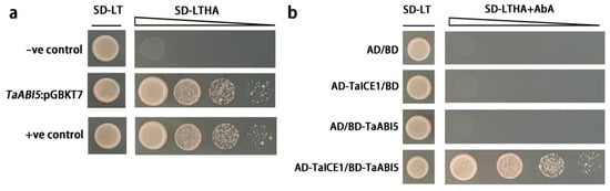 In order to explore the regulatory mechanism of TaABI5 in plant response to cold stress, the full-length TaICE1 into the Gal4 activation domain of the prey vector (AD-TaICE1). BD-TaABI5 and AD-TaICE1 were co-transformed into yeast strain AH109. As shown in Figure 10b, only the yeast co-transferred by TaABI5 and TaICE1 could survive on QDO medium with 40 mM Aureobasidin A (AbA). The results demonstrate that TaABI5 physically associated with TaICE1.