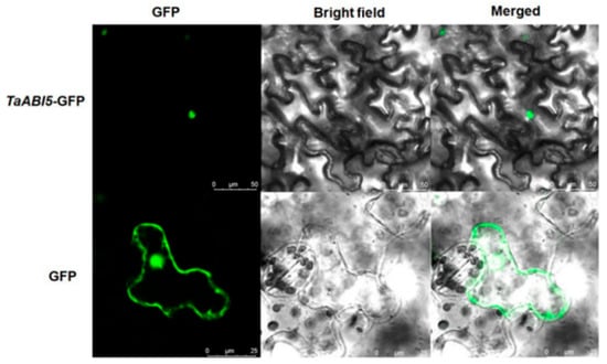 The full-length TaABI5 sequence was inserted into the green fluorescent protein (GFP) vector. The pTaABI5:GFP vector was constructed using the above methods. Nicotiana benthamiana epidermal cells were infected by Agrobacterium-mediated. The transient expression of TaABI5 was detected using laser confocal microscopy.