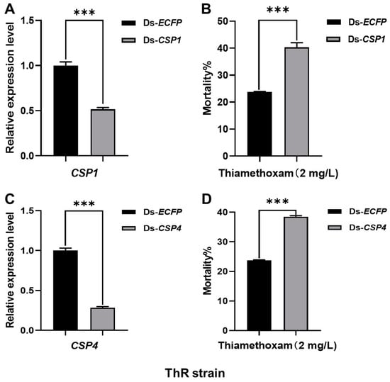 DsRNAs of ECFP, CSP1 and CSP4 were synthesized using the T7 RiboMAX™ Express RNAi System (Promega, Madison, WI, USA) following the manufacturer’s instructions. The artificial diet and rearing methods used in this study were the same as those in previous reports [,]. We mixed dsRNA with the diet to a final concentration of 150 ng/μL, and dsRNA-ECFP was used as the control. Adults of the ThR/SR strain of A. gossypii were reared with the artificial diet for the experiment. After feeding the aphids for 48 h, we collected these aphids for qPCR to compute the efficiency of dsRNA knockdown of gene expression. To analyze the sensitivity of ThR strain aphids to thiamethoxam by knocking down CSP1 and CSP4, and SR strain aphids to spirotetramat by knocking down CSP4, eighty aphids were fed a diet containing thiamethoxam (2 mg/L) or spirotetramat (2500 mg/L) with dsRNA-CSP or dsRNA-ECFP (150 ng/μL). Each treatment included three replicates. We recorded mortality after 48 h and corrected the mortality data using Abbott’s formula [].