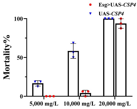 Gastric toxicities of spirotetramat to transgenic Drosophila melanogaster with CSP4. Mean mortality ± SE (n = 3) of Esg > UAS-CSP F1 adult offspring after being fed the mixture of spirotetramat (final concentration: 5000, 10,000, 20,000 mg/L) for 168 h. Each treatment included three replicates, and eight pairs of 2-day-old Drosophila adults were used in each replicate. Error bars indicate 95% confidence intervals (n = 3).