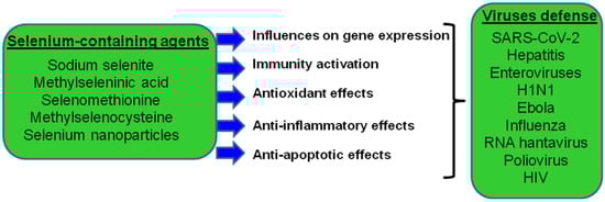 In addition, it is well known that Se is involved in the regulation of defense mechanisms against various viral diseases. Viral infections are a serious public health problem in many parts of the world due to their widespread prevalence, the large number of pathogenic viruses, and significant socio-economic damage, especially due to the recently emerging coronavirus disease, COVID-19. Understanding the mechanisms of infection of the body with viruses, the characteristics of the course of the disease and the relationship with certain vital microelements supplied with food will contribute to the development of more effective ways to resist viral infections.
