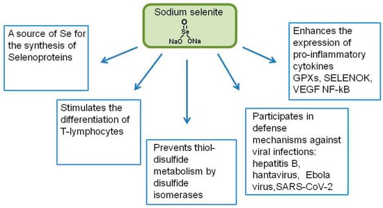 Among the inorganic forms of Se, the most studied is SS, which is involved in the differentiation of T-lymphocytes and enhances the expression of pro-inflammatory cytokines, VEGF, and NF-kB [64,65]. Thus, SS can prevent thiol-disulfide metabolism through disulfide isomerases, and is also involved in defense mechanisms against a number of viral infections—hepatitis B, hantavirus, Ebola virus, and SARS-COV-2 [66,67,68,69].