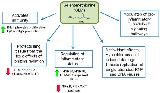 SLM, by modulating the activity of cells of the immune system, has anti-inflammatory properties [103]. Thus, SLM is able to reduce the effect of inflammation in various tissues and organs [103]. A study investigating the effect of organic Se (SLM) on lipopolysaccharide (LPS)-induced inflammation in chicken trachea showed that SLM supplementation enhances immune function and selenoprotein expression, and also reduces LPS-induced inflammation by inhibiting the NF-κB pathway [104,105]. Another study investigated LPS-induced inflammatory kidney damage in broilers. SLM has been demonstrated to have antioxidant and anti-inflammatory effects, and a potential molecular mechanism has been suggested. Histopathological observation demonstrates that SLM ameliorates the LPS-induced characteristic changes in renal inflammatory disease. In addition, SLM modulated the LPS-induced inhibition of the PI3K/AKT pathway, increased expression of caspase 8 and IκB-α, necroptosis marker genes (FADD, RIP1, RIP3, MLKL, and TNF-α), pro-inflammatory factors (NF-κB, PTGE, COX-2, iNOS, IL-1β, and IL-6) and overexpression of HSP60, HSP70, and HSP90 [106]. A similar study was conducted by Cui Y et al., where they showed that SLM improves LPS-induced intestinal immune dysfunction in chicken intestines. LPS supplementation has been shown to reduce selenoprotein expression and induce an inflammatory response, impaired control of cytokine production, decreased immunoglobulin levels, impaired heat shock protein expression, and decreased jejunal defensin expression levels. However, dietary SLM effectively reversed the aforementioned disorder, immune dysfunction caused by LPS [107]. SLM modulation of the pro-inflammatory TLR4/NF-κB signaling pathway and macrophage activity was described in the study of inflammation of the mammary gland of cattle (mastitis) induced by E. coli. SLM attenuated inflammation caused by E. coli by modulating the transmission pathway signaling Toll-like receptor 4 (TLR4)/NF-κB and stimulated macrophages, enhancing their migration and activity [108].