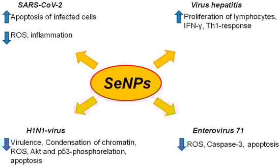 The importance of adequate dietary Se levels and its effective incorporation into selenoproteins for immunity has been demonstrated in cell culture and animal models. Among the 25 known human selenoproteins to date, some of them play an essential role in maintaining the immune function in the body. These include the following selenoproteins: SELENOP, SELENOK, glutathione peroxidase, thioredoxin reductase, and MSRB1 [34,121,122,123,124,125,126,127,128,129,130]. In recent years, approaches have appeared for the treatment of viral infections using Se nanoparticles (SeNP), which have been shown to be effective in preventing viral infections such as H1N1 influenza virus [36], Enterovirus 71 [136,137], hepatitis virus infection [138], and SARS-CoV-2 [32,38].