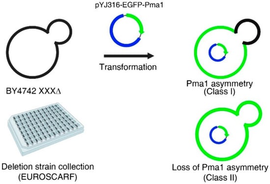 During cell division, the plasma membrane protein Pma1p asymmetrically accumulates in the mother cell, instead of being evenly distributed between mother and daughter cells, in the budding yeast Saccharomyces cerevisiae []. This asymmetric distribution of Pma1p has been suggested to contribute to aging of mother cells and rejuvenation of daughter cells because Pma1p accumulation leads to depletion of cytoplasmic protons, which, in turn, increases vacuolar pH, a hallmark of cellular aging in yeast []. To identify genes that regulate the asymmetric distribution of Pma1p during cell division, we performed a genome-wide screen using a collection of single gene deletion yeast strains. To this end, we transformed yeast cells with a plasmid encoding EGFP-fused Pma1p under the control of the ADH1 promoter (pADH1), which is a constitutively strong promoter, and analyzed Pma1p-EGFP under a fluorescence microscope (Figure 1). About 30% of wild-type cells were classified as the Class II phenotype (symmetric distribution of Pma1p). We sought to identify mutants in which more than 50% of cells had the Class II phenotype. Out of about 5000 single-gene deletion mutants, 12 mutants were finally isolated (Table 1).