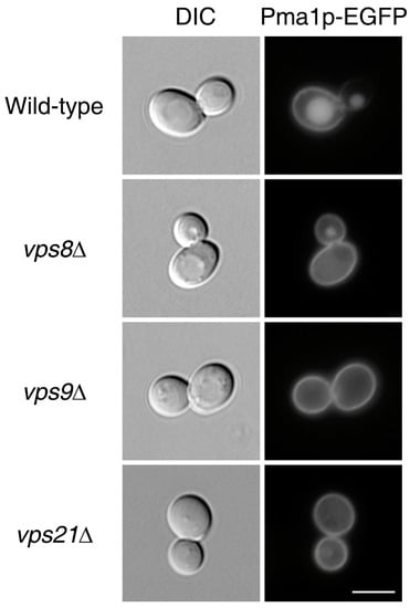 In this study, by performing a genome-wide screen, we identified a series of candidate genes that may regulate the preferential accumulation of Pma1p at the plasma membrane of mother cells. Interestingly, most of these genes are involved in endocytosis. One simplistic explanation of this screening result is that defects in endocytosis block endo-lysosomal degradation of Pma1p, which, in turn, considerably increases the level of Pma1p at the plasma membrane of mother cells and allows diffusion of a portion of excess Pma1p to the plasma membrane of daughter cells. However, because only a small proportion of endocytic genes were identified, general defects in endocytosis are unlikely sufficient to disrupt Pma1p asymmetry between mother and daughter cells. Furthermore, we observed the strongest phenotypes in yeast cells deficient for one of three genes, VPS8, VPS9, and VPS21, which are involved in the same pathway during endocytosis [,]. Vps21p is a Rab GTPase required for transport from endosomes to vacuoles. It is functional only when bound to GTP. This GTP binding is mediated by Vps9p, which exchanges GDP bound to Vps21p with GTP, thereby activating Vps21p. Vps8p is a component of the CORVET complex, a six-subunit complex required for transport from late endosomes to vacuoles, and binds only to the GTP-bound form of Vps21p. Thus, Vps8p is an effector of activated Vps21p []. Is the CORVET complex, or its function, critical for Pma1p asymmetry? Although another CORVET component, Vps3p, was one of our identified candidates, deletion of any of the other four components (Vps11p, Vps16p, Vps18p, and Vps33p) did not markedly disrupt Pma1p asymmetry, suggesting that a CORVET-independent function of Vps8p/Vps9p/Vps21p mediates Pma1p accumulation in mother cells. It was also reported that Pma1p delivery to the plasma membrane requires its association with lipid rafts []. Thus, the lipid rafts of mother cells may be different from those of daughter cells, which may, in turn, affect the asymmetry of Pma1p between mother and daughter cells. Interestingly, however, the effect of lipid rafts on the asymmetric distribution of plasma membrane proteins during cell divisions remains entirely uncharacterized. Thus, future studies will be required to examine this intriguing issue.