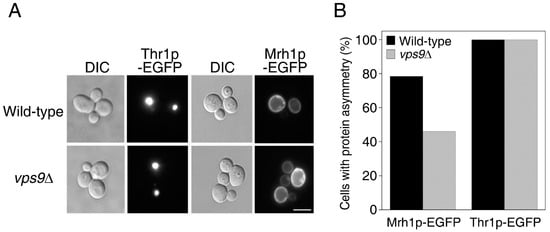 Pma1p is a member of the LARP family []. LARPs are defined as proteins that are retained within mother cells as they undergo repeated asymmetric divisions and that generally contribute to the age-associated phenotype of mother cells []. To test whether genes that regulate the asymmetric distribution of Pma1p are also involved in the asymmetric distribution of other LARPs or are specifically involved in that of Pma1p, we expressed EGFP-fused Mrh1p, a plasma membrane LARP, or Thr1p, a cytoplasmic LARP that forms short rod-like structure [,], in vps9Δ cells. While Thr1p-EGFP was asymmetrically distributed in both wild-type and vps9Δ cells (Figure 3, left), the asymmetric distribution of Mrh1p-EGFP was suppressed by deletion of VPS9 (Figure 3, right). These results indicate that genes that regulate the asymmetric distribution of Pma1p also play a role in the asymmetric distribution of other plasma membrane LARPs during cell division.