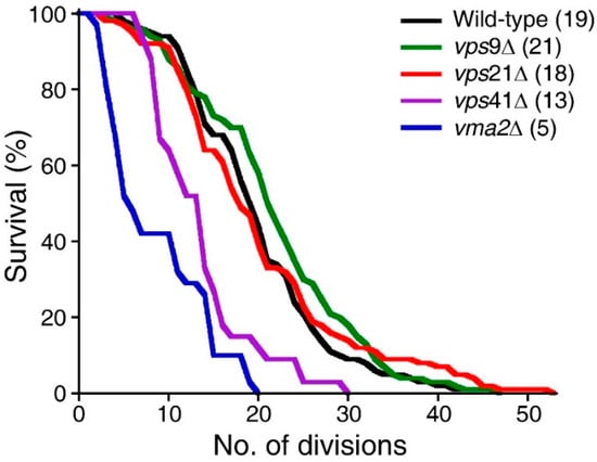Retention of Pma1p in mother cells during cell division and its resulting accumulation in mother cells over repeated cell divisions were suggested to be one of the major factors that affect the RLS of the budding yeast Saccharomyces cerevisiae []. Pma1p activity antagonizes vacuole acidification: over-expression of Pma1p drastically increases vacuolar pH, whereas yeast cells bearing the pma1-105 allele, which encodes Pma1p with reduced activity, retain vacuolar acidity after at least 18 divisions []. Consistent with the idea that the level of Pma1p at the plasma membrane correlates well with RLS, the RLS of cells bearing the pma1-105 allele is about 30% higher than that of wild-type cells []. To examine whether genes that regulate the asymmetric distribution of Pma1p affect RLS, the RLS of wild-type, vma2Δ, vps9Δ, vps21Δ, and vps41Δ cells was measured. Yeast cells lacking the V-ATPase (vacuolar proton pump) subunit Vma2p had a short median lifespan of five divisions (Figure 4, blue line), as previously reported []. The median lifespan of wild-type cells was 19 divisions. Interestingly, however, the median lifespans of vps9Δ and vps21Δ cells were 21 and 18 divisions, respectively, which were comparable with that of wild-type cells. Interestingly, vps41Δ cells had a relatively short median lifespan of 13 divisions (Figure 4, purple line), although only about 56% of these cells had the Class II phenotype, which was markedly lower than the corresponding percentages of vps9Δ and vps21Δ cells (see Table 1). These results suggest that there is no clear correlation between Pma1p accumulation and RLS, and loss of accumulation of Pma1p in mother cells, per se, is not sufficient to affect their RLS.