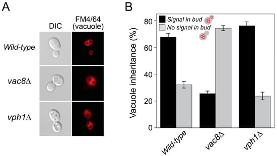 It was reported that an increase in vacuolar pH at an early age limits the lifespan of yeast and mother-daughter asymmetry of Pma1p and that vacuolar pH thereby underlies aging of mother cells [,]. Segregation of damaged mitochondria to daughter cells is blocked during mitosis and, thus, provides daughter cells with healthy mitochondria, which contributes to aging of mother cells and rejuvenation of daughter cells [,,]. Therefore, we examined whether damaged vacuoles (with an increased pH) are evenly segregated into daughter cells during cell division. To this end, wild-type or mutant cells (vac8Δ and vph1Δ) were labeled with FM4/64, a lipophilic dye that eventually accumulates in the vacuolar membrane of live yeast cells [], and vacuoles in mother and daughter cells were analyzed by fluorescence microscopy. Because Vac8p is required for vacuole inheritance [,], significant portions of emerging buds of vac8Δ cells failed to acquire vacuoles from mother cells. Yeast cells lacking Vph1p, a subunit of the vacuole ATPase responsible for vacuolar acidification [], had no defect in vacuole segregation compared with wild-type cells (Figure 5). These data suggest that, unlike damaged mitochondria, damaged vacuoles are normally transported to daughter cells, excluding the possibility that asymmetric segregation of damaged vacuoles underlies aging of mother cells.
