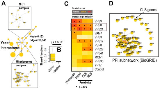 A systems biology approach reveals that Vps8p and Vps21p interact with various proteins involved in CLS and RLS. The systems biology approach identified key drivers of the aging process, such as VPS8 and VPS21. (A) Yeast protein interaction networks are generated from the BioGRID database (6153 nodes and 759,345 edges). This shows protein clusters of the protein interaction networks (nodes are protein clusters, and edges are significant interactions between clusters). The top box indicates protein interactions of the corresponding clusters, which are enriched with the Nrd1 complex proteins. The bottom box shows protein interactions of the corresponding clusters, enriched with the mitoribosome complex proteins. (B) Proteins in clusters share molecular functions (i.e., GO functions), significantly more than randomly-selected proteins (Wilcoxon test p-value = 1.3 × 10−7). (C) Based on network proximity measures, the 12 screened genes (rows of the heatmap) are significantly connected with PMA1 (second column), CLS (third column), and RLS genes (fourth column). Based on a scaled score (Z-score > 0.5), VPS8 and VPS21 are significantly higher on all occasions, likely being critical players in the aging process. The leftmost columns in the heatmap indicate phenotype changes in the 12 screened genes. (D) VPS8 and VPS21 are centrally located at the CLS interaction network, thereby governing the interactions of CLS genes.
