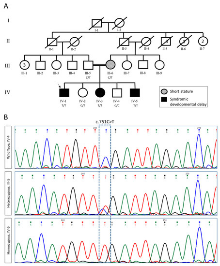Figure 1. Pedigree and segregation analysis of FBXL3 variants. (A) Pedigree of the studied family. Proband is indicated by an arrow. (B) Sanger sequencing of wildtype (WT, IV-4), heterozygous carrier (III-5), and homozygous variant c.751C >T (IV-5).