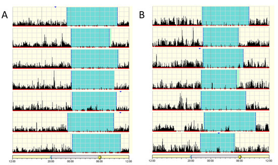Figure 2. Patient actigraphs. Each horizontal segment in the actigraph represents a 24 h period from noon to noon the next day. The black lines indicate physical activity, with height of the lines corresponding to the occurrence and degree of physical activity. Periods of rest are highlighted in light green and sleep in cyan. (A) Patient IV-5, 10-year-old male. (B) Patient IV-3, 18-year-old female. Actigraphs show a regular sleep pattern with a set sleep time and mostly minor variations in wake-up time.