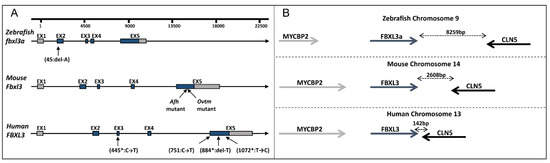 Figure 3. FBXL3 genomic region in humans, mice and zebrafish. (A) Schematic representation of FBXL3 gene arrangement. Untranslated and coding regions are depicted as grey and blue boxes, respectively; introns are depicted as lines. The position of reported mutations in zebrafish (this study), mouse (Afh and Ovtm [6,8]) and humans (*Ansar et al. [10], and this study) are indicated. (B) Illustration of FBXL3 conserved synteny with adjacent genes. Bidirectional arrows indicate the physical distance between nearby genes.