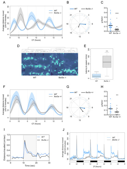 We next assayed rhythmic locomotor activity as a measure of circadian clock regulation at the whole animal level. The locomotor activity of clock-entrained larvae was monitored under constant dim light (DimDim, 7.5 lux) for three days (6–8 days post-fertilization, dpf). Under these constant conditions, WT larvae exhibit robust circadian rhythms of locomotor activity [18,19,20]. The average locomotor activity of WT and fbxl3a−/− larvae is plotted in Figure 4A, revealing a 7.2 h phase-delay of the fbxl3a−/− larvae activity compared with their WT siblings (Figure 4B). Furthermore, a significantly lower median G-factor score [18] was obtained for the fbxl3a−/− larvae activity compared with their WT siblings, indicating greater divergence from 24 h rhythmicity (Figure 4C). Indeed, fbxl3a−/− larvae exhibit highly variable clock-controlled period lengths of activity rhythms compared with their WT siblings. Clustering analysis based on individual data separates WT and mutant fish into two main clusters (p < 0.001); the resulting heat map (Figure 4D) emphasizes the disordered locomotor activity rhythms of fbxl3a−/− larvae, as compared to their WT siblings. Interestingly, heterozygous (fbxl3a+/−) larvae display a mild intermediate phenotype of approximately 3 h phase-delay compared with WT larvae, and a lower G-factor score (Figure 4F–H). To test whether fbxl3a deficiency might simply impair larval motility, larvae were exposed to dark flashes of 10 s each during the light phase, a paradigm known to induce immediate bursts of activity [21]. No statistical difference was observed between the dark flash-induced activity of WT and fbxl3a mutant larvae (Figure 4I), thus ensuring that the mutation did not impair overall larval mobility. These results indicate that fbxl3a deficiency affects circadian rhythms of locomotor activity in zebrafish. Under light/dark (LD) cycles, fbxl3a mutant larvae exhibit daily rhythms, albeit with relatively blunted locomotor activity during the day (light phase, 770 lux) and slightly higher activity during the night (dark phase) compared with their WT siblings. Interestingly, the fbxl3a mutants produce an acute behavioral response to the light-to-dark transition but lack a response to the dark-to-light transition (Figure 4J). This may be the result of the delayed circadian phase in which the mutants are upon lights-on.