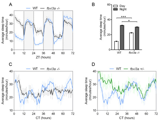 Figure 5. FBXL3a deficiency affects sleep–wake cycles in zebrafish larvae. Sleep analysis of 6–8 dpf fbxl3a−/−, fbxl3a+/ and WT sibling larvae under various lighting conditions. (A) Rhythms of sleep under LD are impaired in fbxl3a−/− larvae. The average sleep time under LD (minutes/hour) is plotted on the y-axis and ZT (hours) is plotted on the x-axis. Error bars represent ± SE (n = 24). White and grey-shaded areas indicate light and dark, respectively. (B) The average sleep time (±SE, n = 24) for total daytime and total nighttime for each genotype under LD conditions. Significant differences in day/night sleep time alterations were found between fbxl3a−/− larvae and their WT siblings (*** p < 0.001 and * p < 0.05 for day and night, respectively, repeated-measures ANOVA). (C) Circadian rhythms of sleep under DimDim, after entrainment by 3 LD and 2 LDim cycles, are impaired in fbxl3a−/− larvae (n = 18) compared to WT siblings (n = 12). The average sleep time (minutes/hour) under DimDim is plotted on the y-axis and CT (hours) is plotted on the x-axis. Error bars indicate ± SE. (D) Circadian rhythms of sleep under DimDim are impaired in fbxl3a+/ larvae (n = 18) compared to WT siblings (n = 12), the WT trace is the same as in C. Sleep measurement was conducted after entrainment by 3 LD and 2 LDim cycles. The average sleep time (minutes/hour) under DimDim is plotted on the y-axis and CT (hours) is plotted on the x-axis. Error bars represent ± SE.