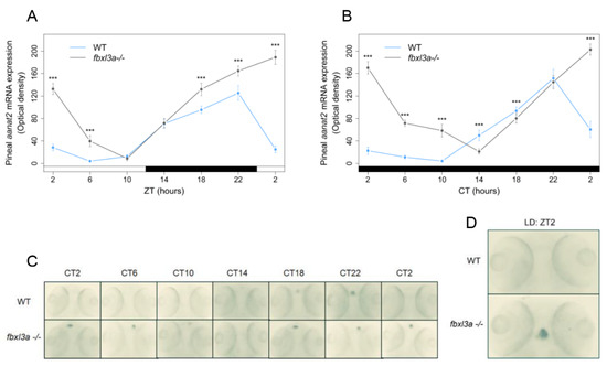 Fbxl3a mutant larvae and WT siblings’ progeny were entrained for 3 days under a LD regime, after which they were sampled at 4 h intervals throughout a 24 h period under LD or constant dark (DD) conditions. Pineal aanat2 mRNA levels were semi-quantified by whole mount in situ hybridization (ISH) followed by optical density measurements of the signal. Consistent with previous reports [20,28,29,30], the levels of aanat2 mRNA in the pineal glands of WT larvae were low during the day (or subjective day) and increased throughout the night, reaching a peak towards the middle to end of the night period. On the other hand, under both LD and DD conditions, irregular levels of pineal gland aanat2 mRNA were detected in the fbxl3a-deficient larvae, characterized by significantly higher overall expression and a delayed phase with respect to their WT siblings (Figure 6). These results suggest that fbxl3a deficiency also affects the molecular oscillator within the pineal gland, a key organ in the circadian clock system of fish.