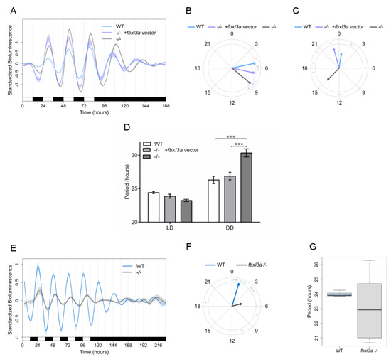 Figure 7. FBXL3a LOF disrupts core molecular oscillation in zebrafish cells. (A) Impaired per1b promoter activity in fbxl3a−/− cell line is partially rescued by exogenous FBXL3a. Standardized luciferase activity in per1b:luc-transfected cell lines derived from fbxl3a−/− and their WT siblings under different lighting conditions. Cells were transfected with the per1b:luc construct and with a FBXL3a expression vector or empty vector. Error bars represent ±SE (n = 4). (B) Phase difference under LD conditions is expressed as activity peak with respect to ZT0, indicating a 3.45 h phase-delay for the fbxl3a−/− cell line, which is partially rescued by exogenously expressed FBXL3a, yielding a 1.61 h phase-delay. Arrows represent the mean value of the studied cell line, dots represent individual well values, and arrow length inversely represents the variation among wells of the same cell line. (C) Phase difference under DD conditions is expressed as activity peak with respect to CT0, indicating a 14.38 h phase-delay of the fbxl3a−/− cell line, which is partially rescued by exogenous FBXL3a, inducing a 1.63 h phase advance. Arrows represent the mean value of the studied cell line, dots represent individual well values, and arrow length inversely represents the variation among wells of the same cell line. (D) Mean period values of bioluminescence rhythms of cells transfected with per1b:luc construct and with the FBXL3a expression vector or empty vector. Period (hours) under LD: WT = 24.42, fbxl3a−/− = 23.24, fbxl3a−/− + FBXL3a expression vector = 23.88; Period (hours) under DD: WT = 26.31, fbxl3a−/− = 30.34, and fbxl3a−/− + FBXL3a expression vector = 26.88. Error bars represent ± SE (n = 8). Statistical differences were assessed by ANOVA, followed by pairwise comparisons adjusted by the BH procedure controlling FDR at level 0.05 (*** p < 0.001). (E) Standardized bioluminescence in E-box:luc-transfected cell lines derived from fbxl3a−/− and their WT siblings under five LD cycles followed by 5 days of DD. Error bars represent ± SE (n = 8 wells). (F) A delayed phase of the synthetic E-box promoter activity in the fbxl3a−/− cell line under LD. Phase difference expressed as activity peak with respect to ZT0, indicating a 4.07 h difference between cell line genotypes. Arrows represent the mean value of the studied cell line, dots represent individual well values, and arrow length inversely represents the variation among wells of the same cell line. Significance was determined using Watson–Williams test (p < 0.001). (G) Abnormal period distribution of E-box:luc expression in fbxl3a−/− cell line. Mean period values and distribution of luciferase activity under five LD cycles (WT = 23.91 IQR = 0.38, fbxl3a mutant = 23.37 IQR = 7.29).