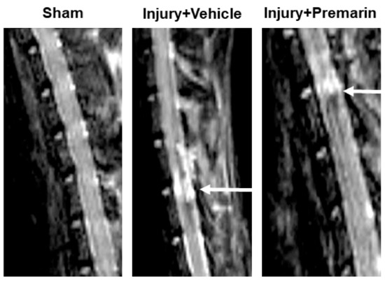 PRM reduces edema and preserves tissue integrity at day 7 following SCI. MRI imaging of spinal cords from sham and injury animals treated with either vehicle or PRM were imaged using a 7 Tesla (T) Bruker BioSpec USR system (Billerica, MA, USA). Imaging in the injured cords treated with vehicle clearly showed the injury lesion when compared to sham animals. PRM treatment decreased edema and preserved tissue integrity at injury site shown by a reduced lesion volume compared to that of the vehicle-treated injured rats. Lesion site is indicated by white arrow.