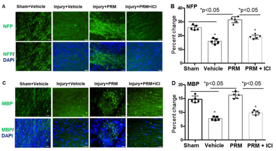 PRM treatment increased neurogenesis and decreased myelin damage at day 7 following SCI. Increased levels of immunostaining of NFP (A,B) and MBP (C,D) were detected in longitudinal lesioned sections of injured rats following treatment with PRM. These NFP and MBP levels were significantly improved in PRM treated rats when compared with vehicle treatment. In contrast, there was a significant reduction of NFP protein expression in PRM + ICI treated rats as compared to PRM, indicating the effects of PRM treatment. Similarly, MBP expression levels were also markedly reduced in PRM + ICI treated rats as compared to PRM. These data suggest that neuronal growth as well as myelination are improved following treatment of SCI rats with PRM. Representative immunofluorescent staining images were shown (Magnification, 20×, n = 5–6). Statistical analysis was performed by one-way ANOVA followed by Fisher’s post-hoc test. Error bars are standard deviations. (* p < 0.05).