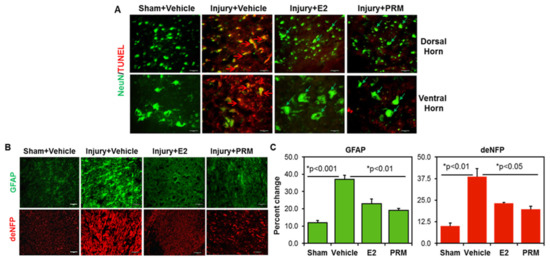 PRM decreased neuronal cell death and axon/myelin damage at day 7 following SCI. (A) Neural cell death was remarkably detected in vehicle treated injured rats as determined by double immunofluorescence staining using NeuN (neuron marker, green) and TUNEL (cell death marker, red). TUNEL positive cells are present in dorsal and ventral regions of injured spinal cords from vehicle treated groups as indicated by red arrows in the merged image (yellow). (Magnification, 200×, n = 4–6). PRM treatment markedly reversed neuron death as compared to vehicle treatment (green arrows). E2 treatment was used a positive control. (B,C) Immunohistochemical analysis of SCI tissues with astroglial marker GFAP showed significant reduction of astroglial reactivity in PRM treated injured rats (B, upper panel). Quantitative analysis of GFAP images by ImageJ (National Institutes of Health (NIH), Bethesda, MA, USA) showed that the effect of PRM on reducing astrogliosis was similar to that observed in E2-treated rats and was used as a positive control (C, left panel). Representative immunofluorescent image using an antibody against GFAP (green) is shown (Magnification, 200×, n = 4–6). Both PRM and E2 treatment reduced axonal damage at day 7 after SCI as indicated by a decrease in immunofluorescent staining of deNFP, a marker of axonal degeneration (B, lower panel; C, right panel). Representative immunofluorescent staining image using antibody against deNFP (red) is shown (magnification, 200×, n = 4–6). Data suggest that PRM promotes cell survival following SCI.