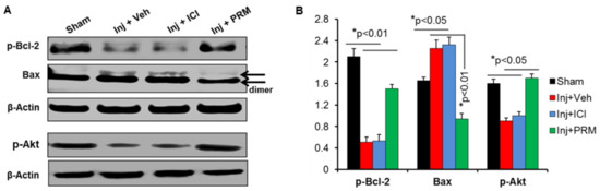 To investigate whether neuronal death observed in TUNEL assay correlated with the expression of apoptotic protein in injured spinal cord, the tissue samples were analyzed by Western blotting. Decrease in the levels of the pro-apoptotic Bax protein was detected following PRM treatment in the injured spinal cord at day 7 after SCI along with a parallel increase in the levels of the anti-apoptotic protein p-BCL-2 (Figure 5A,B; p < 0.01). The effects of PRM in downregulating the expression of Bax dimer (arrows) and upregulating p-Bcl-2 proteins in injured rats indicate that PRM inhibits cell death and may support cell survival in SCI. It is well-known that PI3K/Akt is directly related to the survival of cells, and it plays an important role in the process of resisting apoptosis and promoting the survival of neuronal cells. Thus, the expression of p-Akt (active Akt) was analyzed by western blotting where p-Akt expression was significantly reduced in vehicle + injury and injury + ICI groups (Figure 5A,B), indicating that cell survival was reduced which was consistent with the decreased p-BCL-2 expression. The expression of p-Akt was significantly increased following treatment with PRM (p < 0.05), suggesting that the survival of neuronal cells in the injured spinal cord was restored by PRM. The reduction of apoptotic Bax, restoration of anti-apoptotic p-BCL-2, and upregulation of p-Akt survival signal by PRM may play crucial roles in protecting neurons after SCI.