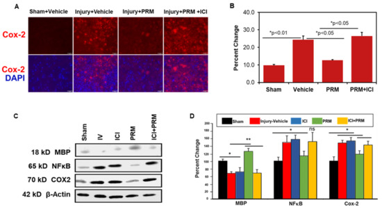 Following SCI, animals were treated with either vehicle or PRM, and the expression levels of several pro-inflammatory proteins were determined by immunohistochemistry and Western blotting. COX-2 immunostaining clearly indicated reduced levels of protein expression following PRM treatment compared to vehicle-treated rats (Figure 6A,B), which was confirmed by western blot analysis (Figure 6C,D). PRM treatment also attenuated the levels of another inflammatory mediator, NF-κB (Figure 6C,D), as shown by Western blot analysis. These reductions in inflammatory mediators were correlated with preservation of myelin, as indicated by increased levels of MBP following PRM treatment (Figure 6C,D; ** p < 0.01).
