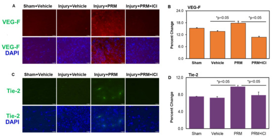 An increase in the expression of major angiogenic markers VEG-F (Figure 7A,B) and Tie-2 (Figure 7C,D), as determined by immunofluorescent staining and corresponding densitometric analyses, indicated PRM treatment improved angiogenesis in the subacute phase (day 7) of SCI. In the presence of the ICI inhibitor, the levels of VEGF, a major growth factor promoting blood vessel growth (red), and Tie-2, an important angiopoietin receptor (green), were brought to the levels of the control groups (Figure 7).