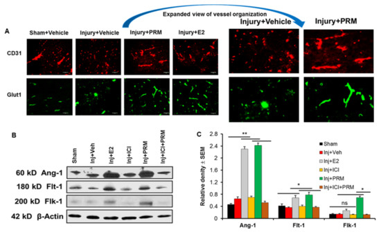 PRM treatment for 7 days increased the expression of CD31 and GLUT1 angiogenic markers in SCI. (A) PRM improved angiogenesis in penumbra at day 7 post-SCI indicated by an increase in immunostaining of the angiogenesis markers CD31 and GLUT1. Expanded view of CD31 and GLUT1 in injury + vehicle vs. injury + PRM represents marked differences in vessel organization. The effect of PRM on increased angiogenesis was similar to that observed in E2-treated rats (positive control) following SCI. Representative immunofluorescent staining images using antibody against CD31 (red) and GLUT1 (green) are shown (magnification, 200×, n = 4–6). (B) PRM treatment also increased the expression of other angiogenesis-related proteins, such as Ang-1, Flt-1, and Flk-1, as shown by representative western blotting. (C) E2 and PRM significantly increased angiogenic markers in injured spinal cord as determined by densitometric analysis using ImageJ software, NIH, Bethesda, MA, USA). * p < 0.05, ** p < 0.01. ns = not significant.