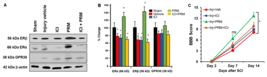 PRM treatment for 7 days increased expression of E2 receptors following SCI and promoted improved motor function in SCI. PRM treatment increased the expression of E2 Receptors, Erα and Erβ, following SCI as shown by Western blotting (A), and densitometric analysis of protein bands (B). In contrast, PRM did not significantly alter the levels of GPR30, a different E2 receptor (A,B), suggesting the increased expression of Erα and Erβ receptors is generated by PRM treatment. The increase in the levels of ER receptors was reversed by the addition of ER antagonist (ICI), further indicating that the neuroprotective action of PRM is based on their specificity to both E2 receptors. n = 10. * p < 0.05 compared to sham animals, and # p < 0.05 compared to vehicle treated SCI animals. (C) BBB score was determined for SCI rats treated with vehicle control, ICI control, PRM, and PRM + ICI as described in the methods. Rats were graded weekly using the BBB scale to examine motor function after SCI. PRM treated rats showed significantly higher BBB scores compared to controls or ER inhibitor (ICI) at day 14. * p < 0.05, ns = not significant.