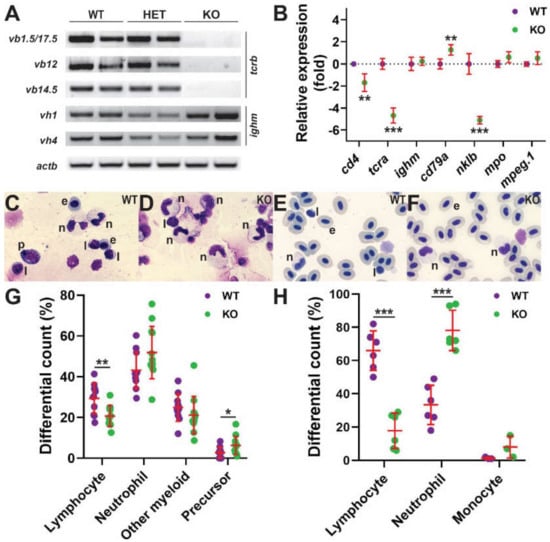 Effect of Il-2rγc.a ablation on later hematopoiesis. (A,B) Gene expression analysis. Larvae (28 dpf) obtained from in-crossing il2rgawt/mdu2 heterozygotes were harvested for gDNA and total RNA. The gDNA was used for the identification of wild-type (WT), heterozygote (HET), and homozygote knock-out (KO) siblings, and the RNA was subjected to RT-PCR with primers specific for T cell receptor β chain V(D)J-Cβ rearrangements (tcrb: vb1.5, vb12, vb14.5), B cell immunoglobulin M heavy chain gene rearrangements (ighm: vh1, vh4), and β-actin (actb) as a control (A) RT-negative controls yielded no products (data not shown) (n = 2). (B) Adult kidney derived total RNA was subjected to qRT2-PCR with gene markers of T cells (cd4, tcra), B cells (ighm, cd79a), NK cells (nklb), neutrophils (mpo), and monocyte/macrophages (mpeg1.1) (B) Data was normalized relative to actb and represented as relative fold change compared to wild-type fish, with mean and SD shown in red and statistical significance indicated (**: p < 0.01, ***: p < 0.001, n = 6). Histological analysis (C–H) Representative images of Giemsa-stained kidney (C,D) and blood (E,F) cells were obtained from WT (C,E) and KO (D,F) fish. Abbreviations: e, erythrocyte; l, lymphocyte; n, neutrophil; p, precursor. Differential counts of kidney (G) and blood (H) cells, showing results for individual embryos, with mean and SD in red and statistical significance indicated (*: p < 0.05, **: p < 0.01, ***: p < 0.001, kidney: n = 11–12, blood: n = 6).