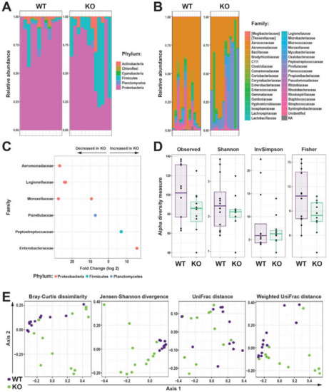 Statistical analysis on the bacterial microbiome was performed in R. Relative abundance of bacteria was visualized in different sample types, classified to the phylum and family levels. To identify differences in the bacterial microbiome between WT and KO groups, permutated multivariate analysis of variance (PERMANOVA) was conducted. The R package DESeQ2 [44] was used to identify taxonomic units that were differentially abundant within groups. Results for statistical tests were considered to be significant, where p values < 0.05. For DESeQ2 results, the threshold for statistical significance was a false detection ratio (FDR) < 0.05. Alpha diversity using Observed, Shannon, InvSimpson, and Fisher’s diversity indices were computed using the richness function in the package phyloseq [45] and visualized using boxplots with the phyloseq and ggplot2 packages. Differences were tested with the Welch two-sample t-test for the Shannon, Observed and Fisher indices, and Wilcoxon rank sum exact test for the InvSimpson index. The final Amplicon sequence variant (ASV) dataset was filtered using the Callahan workflow [46]. Beta-diversity was evaluated with Bray-Curtis, Jensen-Shannon, and UniFrac and were visualized using Principal Coordinate analysis (PCoA) plots with phyloseq.