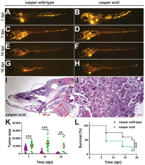 Effect of Il-2rγc.a ablation on tumor immunity. (A–H) Representative casper fish harboring il2rgawt/wt (casper wild-type) (A,C,E,G) or il2rgamdu2/mdu2 (casper scid) (B,D,F,H) injected with fluorescently-labeled human HCT116 colorectal cancer cells imaged at the indicated days post injection (dpi). (I–I’. Histology of a representative tumor from a casper scid fish at 18 dpi at low magnification (5×, I) and of the boxed area at high magnification (40×, J). (K) Quantitation of tumor area showing results for individual embryos, with mean and SEM in red. (L) Kaplan–Meier survival curve of transplanted fish. For panels (K–L), statistical significance is indicated (**: p < 0.01, ***: p < 0.001, n = 11–24).
