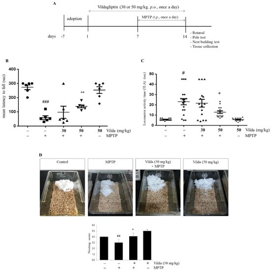 Vildagliptin inhibited the MPTP-induced motor impairments in mice. (A) Schematic representation of the treatment and behavioral study schedule for animal experiments. Mice were treated with vildagliptin (30 or 50 mg/kg, p.o.) or vehicle once per day for seven days. After that, mice were co-treated with MPTP (30 mg/kg, i.p.) or vehicle for another seven consecutive days. Motor function was assessed using (B) the rotarod test, (C) pole test, and (D) nest building test. All behaviors were analyzed on the 14th day after the last injection of MPTP. All values represent the mean ± SEM for 6 mice in each group. # p < 0.05, ## p < 0.01, ### p < 0.001 compared to the control group, * p < 0.05, ** p < 0.01 compared to the MPTP group.