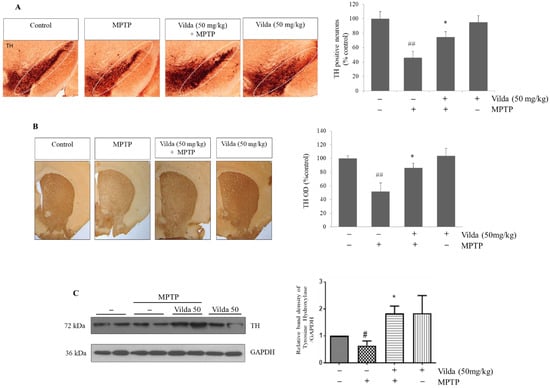 MPTP-induced motor dysfunction results from loss of dopaminergic neurons in the SNpc and striatum []. To investigate the effect of vildagliptin against MPTP-induced damage in dopaminergic neurons, tyrosine hydroxylase (TH)-immunoreactive cells in the SNpc and striatum of mice were quantified. Consistent with previous reports [,], MPTP induced a severe reduction in TH-positive cells in the SNpc of mice (Figure 2A). Vildagliptin pretreatment markedly increased TH-immunoreactive cells in the SNpc region compared to those in the MPTP group, suggesting that vildagliptin has protective effects against MPTP-induced degeneration of dopaminergic neurons. In the striatum, MPTP treatment reduced the number of TH-immunoreactive neurofilaments, while vildagliptin pretreatment greatly hindered this loss of TH expression (Figure 2B). Moreover, no difference in TH-immunoreactive neurons was observed between the vildagliptin alone-treated group and the control group. TH protein expression in the SNpc was also analyzed by immunoblotting assay and was quantified (Figure 2C). MPTP treatment reduced the level of TH expression compared to that in the control, whereas vildagliptin treatment markedly prevented the decrease in TH level by MPTP.