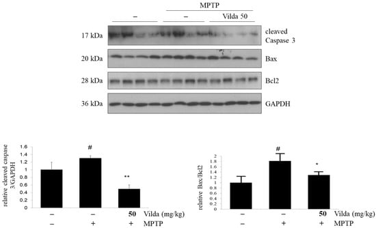 Vildagliptin attenuated MPTP-induced Bax/Bcl2 ratio and cleaved caspase-3 protein expression in mouse brains. Mice were treated with vildagliptin (50 mg/kg, p.o.) or vehicle once per day for seven days. After that, mice were co-treated with MPTP (30 mg/kg, i.p.) or vehicle for another seven consecutive days. After the behavioral tests, mice were sacrificed, and striatum tissues were collected. Striatum samples were used for immunoblots of caspase-3, Bax, and Bcl2 protein expression and densiometric quantification analysis. GAPDH expression level was used as an internal control. Values are presented as mean fold-change ± SEM relative to the control (n = 6). # p < 0.05 compared to the control group, * p < 0.05, ** p < 0.01 compared to the MPTP group.