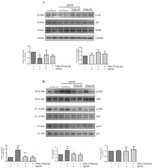 Vildagliptin restored MPTP-induced dephosphorylation of Akt and phosphorylation of ERK and JNK in the striatum. Striatum samples were used for immunoblots of Akt and MAPKs pathways. (A) Representative immunoblots of phospho-Akt, Akt, BDNF and GAPDH protein in mice striatum samples and their densiometric quantification. (B) Representative immunoblots of phospho-ERK, ERK, phospho-JNK, JNK, phospho-p38 and p38 protein in mice striatum samples and their densiometric quantification. Total Akt, ERK, JNK and p38 protein level was used as an internal control for their respective phosphorylated forms. Values are presented as mean fold-change ± SEM relative to the control (n = 6). # p < 0.05, ## p < 0.01, ### p < 0.001 compared to the control group, * p < 0.05, *** p < 0.001 with compared to the MPTP group.
