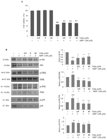 Vildagliptin maintained viability and phosphorylation of Akt, ERK and JNK in SH-SY5Y cells treated with MPP+. Vildagliptin (2.5, 5, and 10 μM) was pretreated for 2 h and exposed to MPP+ (200 μM) for 48 h. (A) Cell viability was measured by MTT assay, and (B) protein expressions of phospho-Akt, Akt, phospho-ERK, ERK, phospho-JNK, JNK, phospho-p38 and p38 were evaluated by immunoblot and densitometric analyses. MTT assay values are expressed as a percentage of the corresponding control cells and are presented as mean ± SD (n = 3). Total protein level of Akt, ERK, JNK or p38 was used as an internal control for their respective phosphorylated forms. Immunoblot densiometric values are presented as mean fold-change ± SEM relative to the control. ## p < 0.01, ### p < 0.001 compared to the control, * p < 0.05, ** p < 0.01 compared to the MPP+ group.