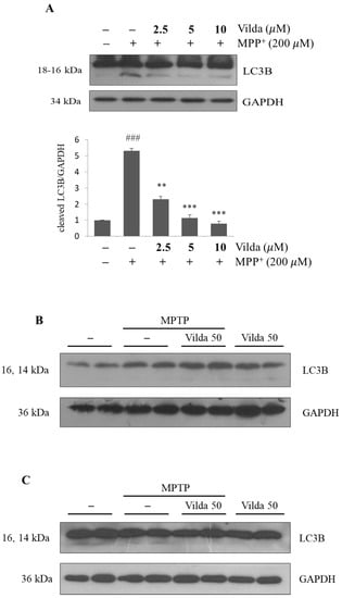Autophagy is a key mechanism in various physiopathological processes, including growth, development, cell death, and survival. Autophagy is one of the pathogeneses of PD, in which a defective process leads to an imbalance in homeostasis in neurons, resulting in an increase in the number of autophagosomes in the brain tissue []. Many recent studies have reported that autophagy is induced by MPP+ treatment in in vitro PD models [,]. Therefore, we examined whether vildagliptin regulated autophagy using the immunoblotting of the autophagy marker microtubule-associated protein 1A/1B-light chain 3B (LC3B) in MPP+-treated SH-SY5Y cells. As shown in Figure 6A, LC3B-II conversion was apparent in the MPP+-treated group, whereas vildagliptin pretreatment significantly hindered conversion of LC3B-II. These results imply that vildagliptin inhibited MPP+-induced dopaminergic neuronal autophagy. Next, we examined whether vildagliptin regulated autophagy in the SNpc and striatum of the MPTP model mouse (Figure 6B,C). However, we failed to find any alterations of LC3B expression and LC3B-II conversion with MPTP and/or vildagliptin.