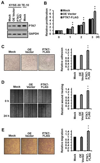 2.1. PTK7 Overexpression Increases Proliferation, Adhesion, and Migration in ESCC KYSE-30 Cells